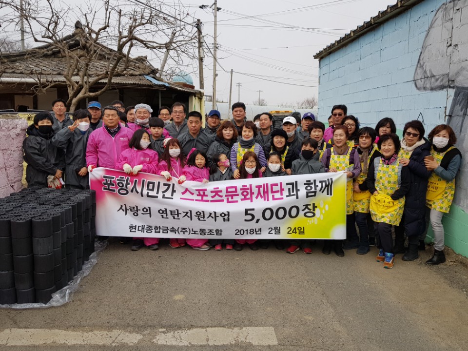 이번 사업은 현대종합금속 20여명 노조원과 포항시 민간스포츠문화재단, 문화복지사 포항시협회 회원30여명이 동참하여 홀몸어르신 가가호호 방문하여 연탄 배달을 하였다.